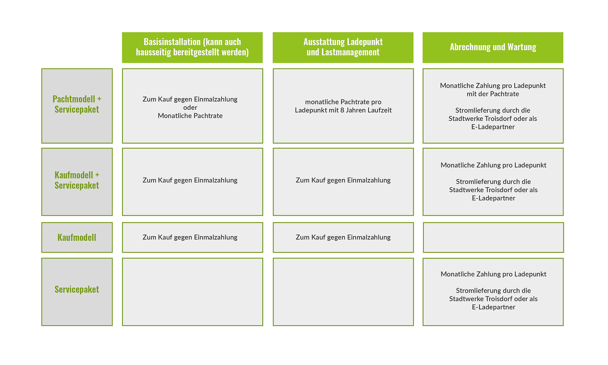 Wir bieten Ihnen drei Modelle an. Inklusive oder exklusive Abrechnung von Ladevorgängen und der Wartung der Ladeinfrastruktur. Darüber hinaus das Pachtmodell sowie das Kaufmodell mit und ohne Servicepaket.