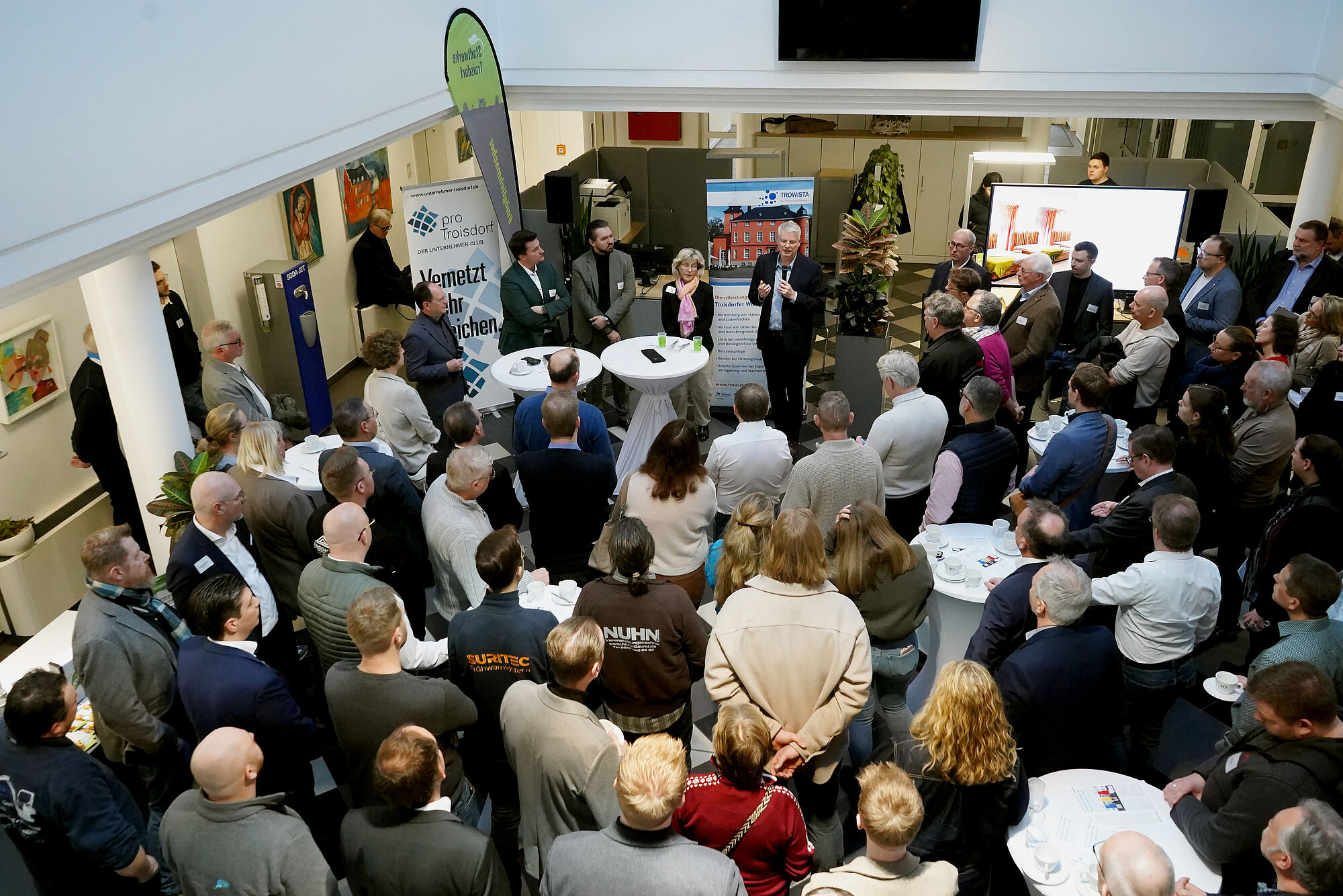 Netzwerken, Gespräche führen und neue Impulse mitnehmen – genau darum ging es beim ersten Unternehmerfrühstück des Jahres bei den Stadtwerken Troisdorf. Mehr als 100 lokale Unternehmerinnen und Unternehmer waren der Einladung des Unternehmer-Clubs pro Troisdorf und der Wirtschaftsförderung TROWISTA gefolgt und füllten am frühen Morgen das Stadtwerke-Kundenzentrum in der Poststraße mit Leben. Der Lokalversorger trat als Gastgeber gemeinsam mit seinen Schwesterunternehmen AGGUA TROISDORF und TroiLine auf; auch der Abwasserbetrieb Troisdorf, AöR (ABT) war vor Ort präsent. Im direkten Austausch mit den Teilnehmenden begrüßte Troisdorfs Bürgermeister Alexander Biber die Gäste und nutzte den Vormittag für den direkten Austausch mit der lokalen Wirtschaft.
